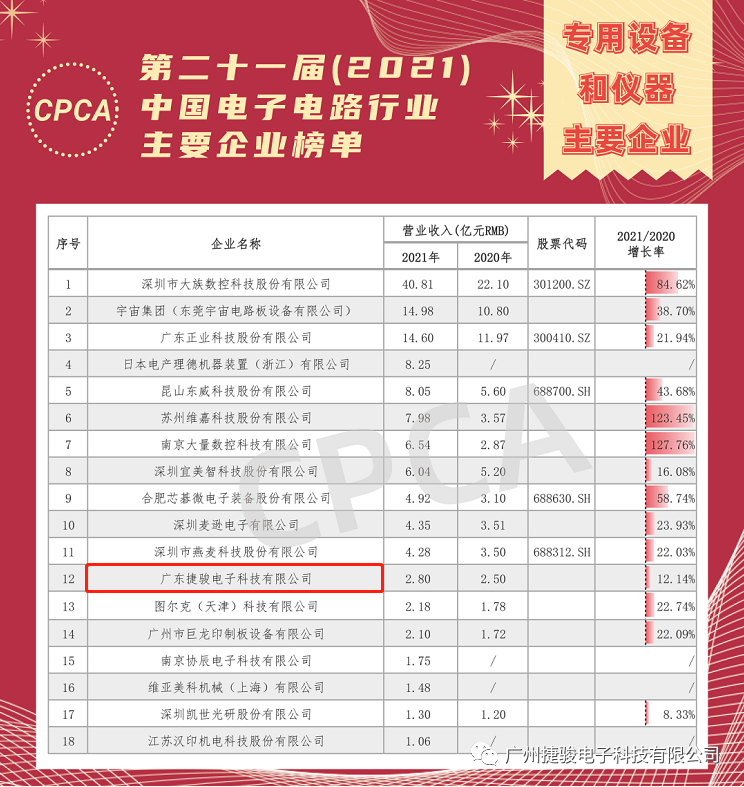 5月18日,由中國(guó)電子信息行業(yè)聯(lián)合會(huì)和中國(guó)電子電路行業(yè)協(xié)會(huì)聯(lián)合發(fā)布了第二十一屆(2021)中國(guó)電子電路行業(yè)主要企業(yè)榜單,“廣東捷駿”以出色的表現(xiàn),榮登“專(zhuān)用設(shè)備和儀器主要企業(yè)”榜單。